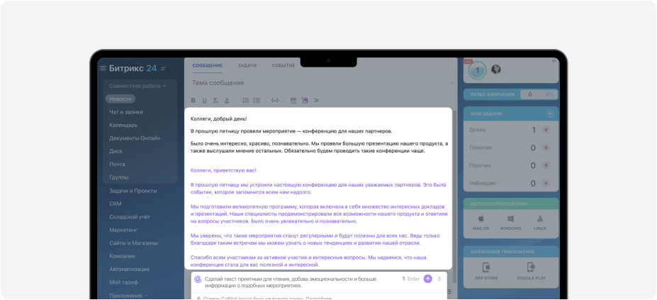 Рассмотрим, как использовать CoPilot с различными модулями «Битрикс24» и его помощь в повседневных задачах.