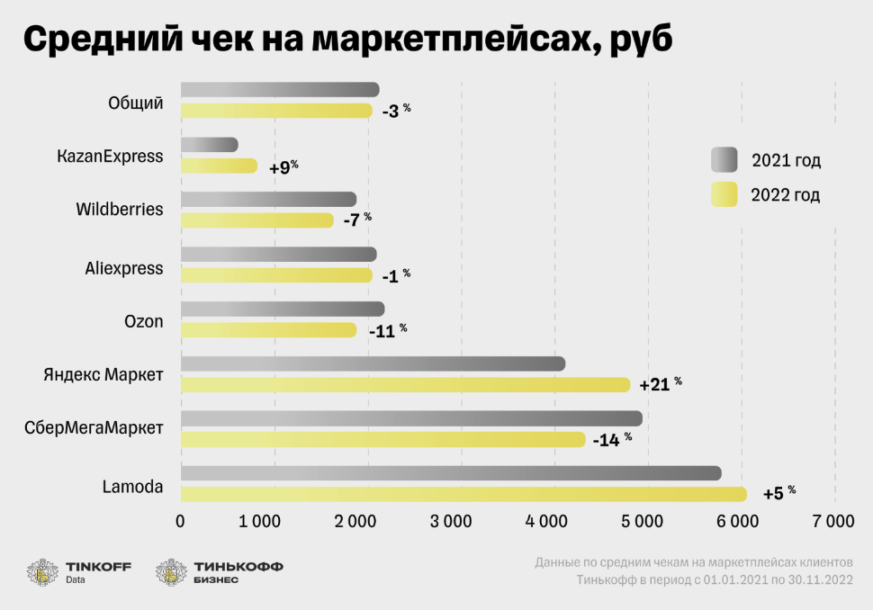 Статистика по среднему чеку на самых популярных маркетплейсах («Тинькофф»)