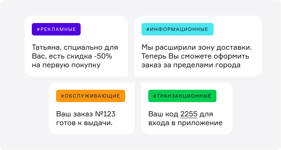 - уведомляют о состоянии счета или предстоящих платежах, статусе доставки посылки и т. д.;