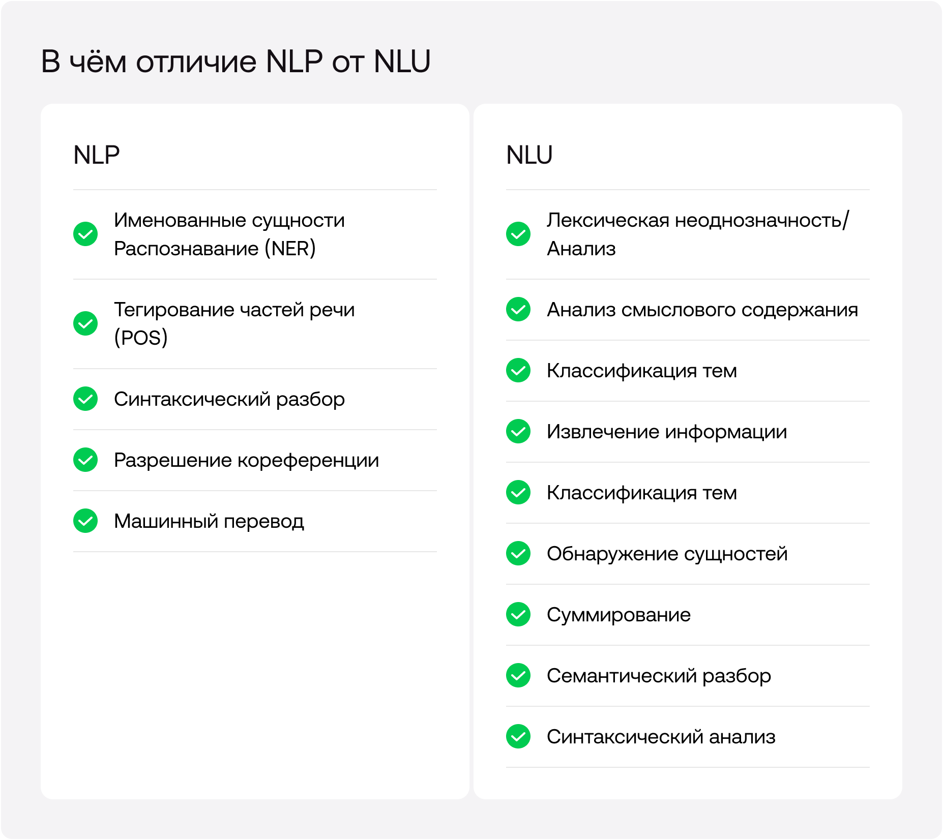 NLU (понимание естественного языка) является подразделом NLP. Он не только распознаёт человеческую речь, но и понимает контекст, намерения, настроение.